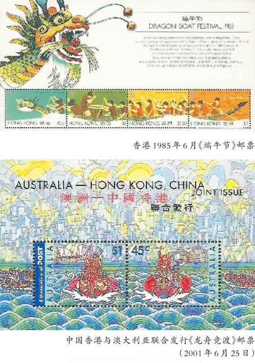 赛龙舟在我国港澳台邮票中也多次出现:1975年7月31日香港的《香港节日》邮票,其中第三枚“端午节”,图案为七巧板拼成的龙舟;1985年6月19日香港的《端午节》邮票,全套4枚连印连图,图案为乘风破浪、拼力前行的龙舟,同时发行这套邮票的小全张;1994年6月8日香港的《中国的传统节日》邮票,其中第一枚“端午节”,图案为中国传统木刻版画《端阳竞渡》图,画面为岩石上持卷行吟的屈原立像,背景为水上竞渡龙舟;1995年3月22日香港的《香港国际体育活动》邮票,其中第一枚“国际龙舟赛”,图案为水面上赛龙舟的激烈竞技场面;2001年6月25日,香港与澳大利亚联合发行一套2枚《龙舟竞渡》邮票;2012年5月22日香港的《香港节日》特别邮票,其中第四枚“端午节”,图案中上下两个正六边形,上为龙舟头的特写,下为龙舟竞技的热烈场面。1987年5月29日澳门的一套2枚《端午节》邮票,图案分别为龙舟头与竞渡的龙舟。1966年6月22日台湾的《民俗》邮票,其中第一枚“龙舟竞渡”。图案为在蓝色的水面上两艘龙舟敲锣打鼓激烈竞技的画面;2002年2月26日台湾发行《台湾民俗活动》邮票,其中第四枚“划龙舟”。